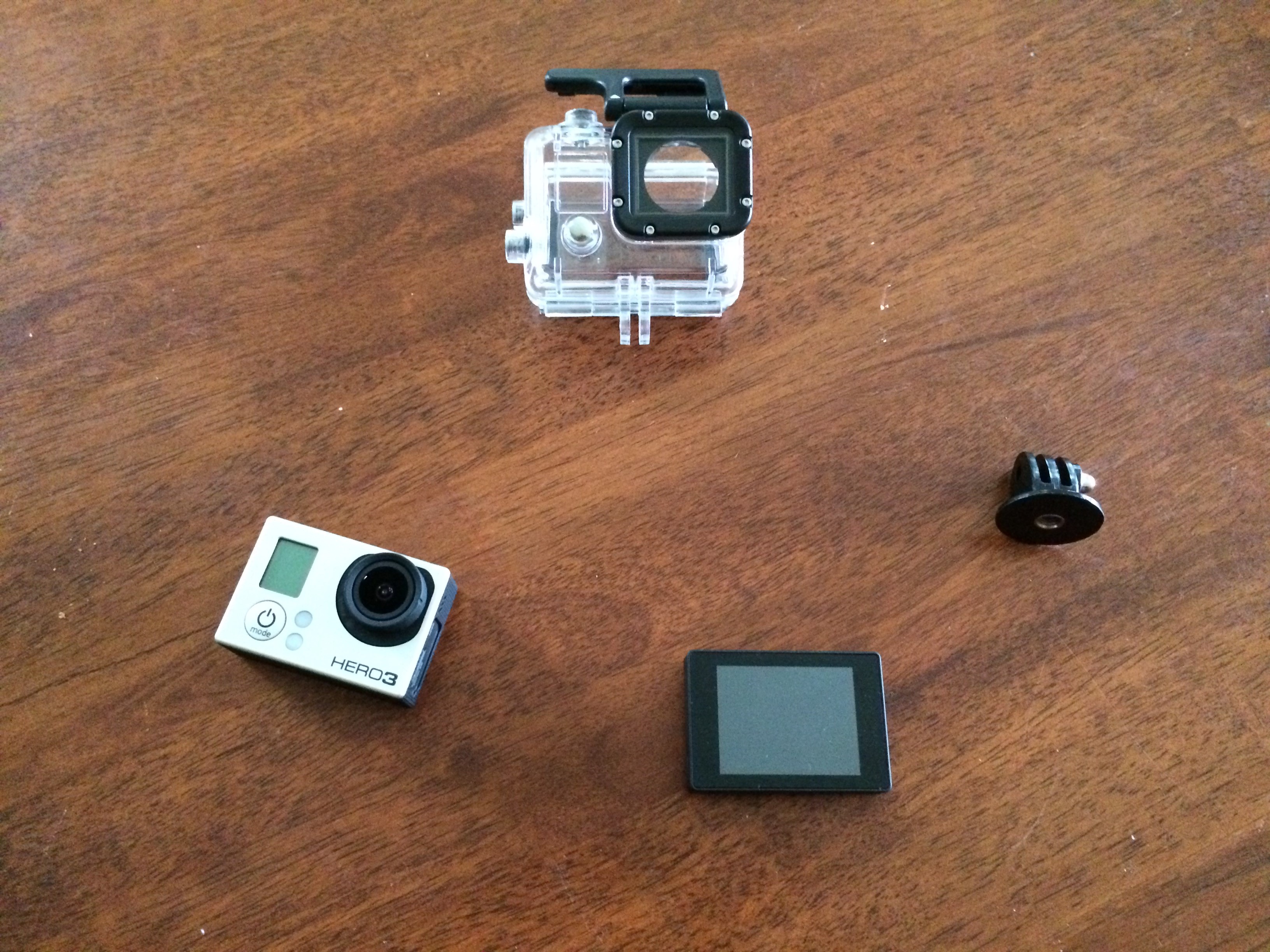 The next day I had in my hands a GoPro, LCD back, tripod adapter and “The frame” for mounting it without its protective (but sound muffling!) case. “The frame” is not in the photo, as it’s on my desk at work.
