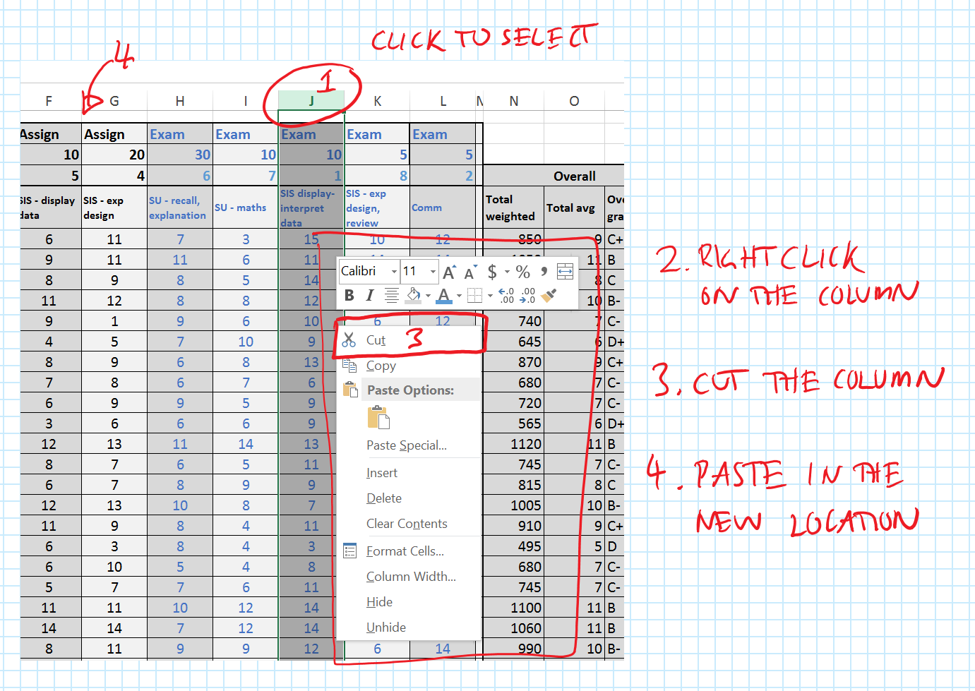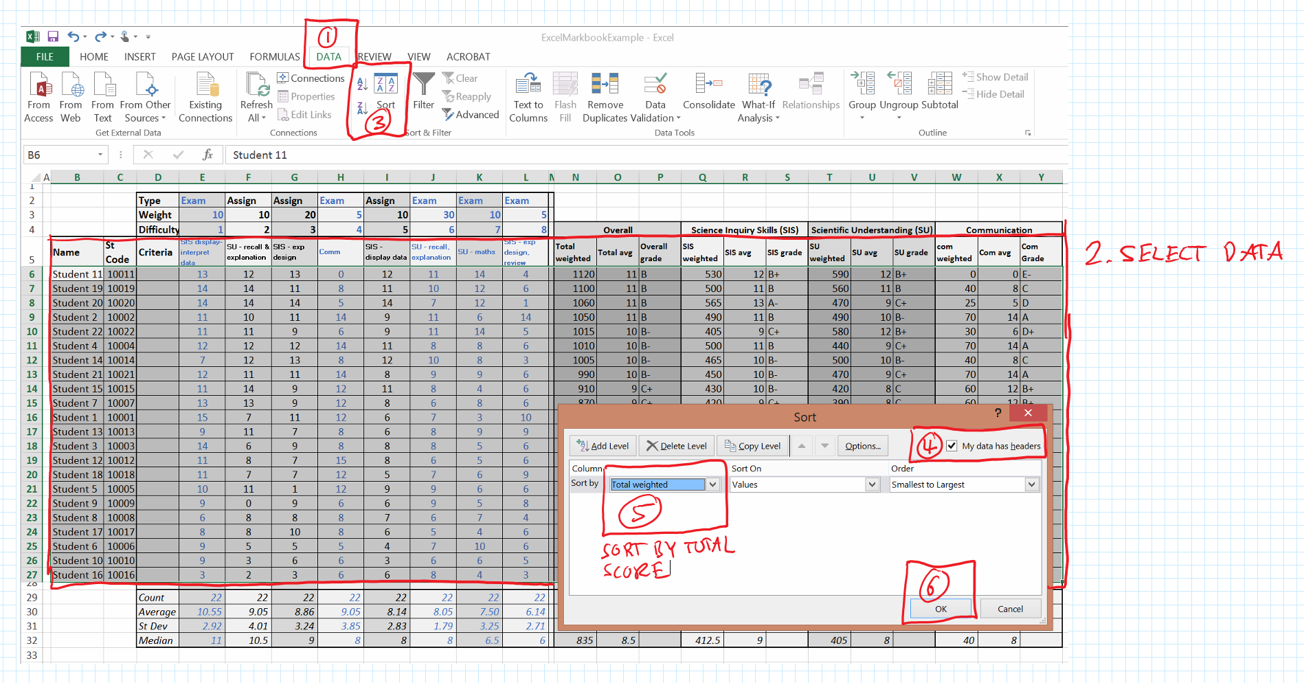 Once this is done. The students need to be ordered from highest to lowest overall mark, simply by selecting all the data and using the sort command.